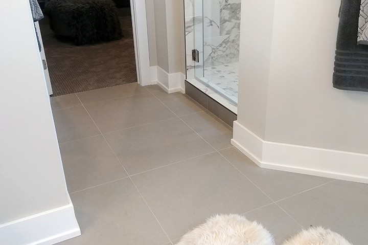 The homes at the Parade had hardwood floors throughout, I wanted to concentrate on what else was there – carpets, tile, and the lower level finishes. But first, hardwood – the planks are larger, like we have been seeing the last few years. My favorite look was an unexpected lighter wood used for the main level flooring, but then the stairs were a darker stained wood. This warm contrast helped ground the neutral and white interior and the wrought iron used for the hand railing on the stairs.